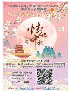 Please join us on Sunday, 10/5/2025 from 11 am – 2 pm for the Chinese Moon Festival celebration at 3396 Johnson Ave in San Luis Obispo. Community Worship & Moon Festival Luncheon for the Chinese Community Members. Please come to worship and enjoy the feast with us.