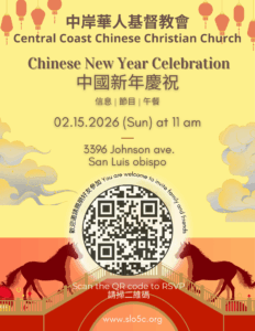 Please join us on Sunday 02/15/2026 for worship service at 11am for Chinese Church’s Chinese New Year celebration at 3396 Johnson Ave in San Luis Obispo. There will be free food: lunch。If you have questions, contact info@slo5c.org. Please RSVP by 02/13/2026.